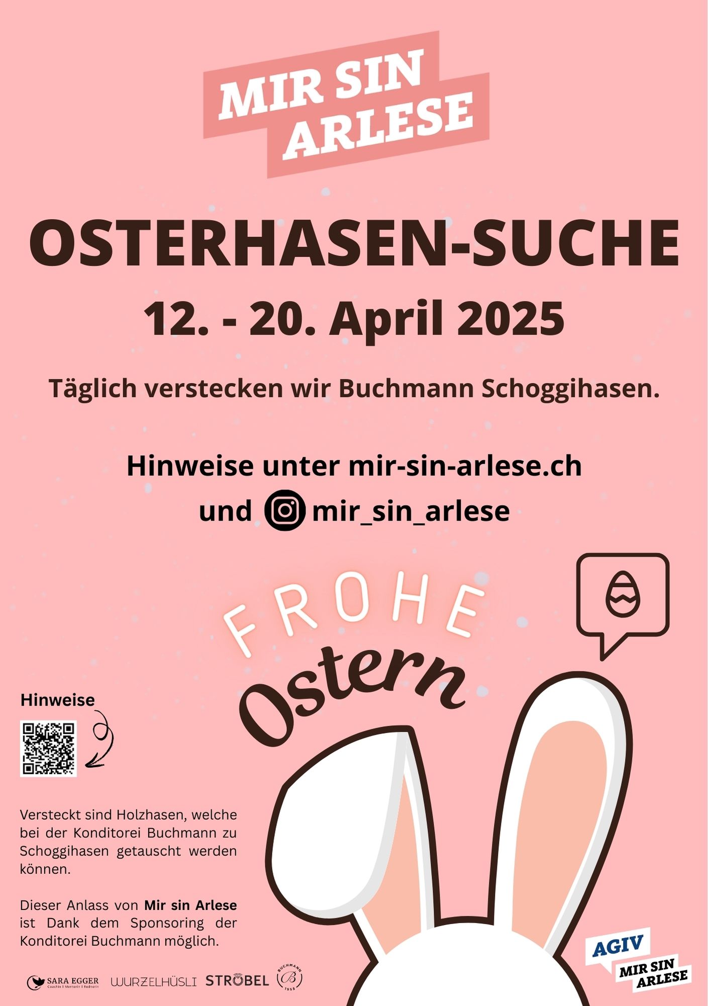 Täglich verstecken wir Schoggihasen im Dorf, Hinweise findest du jeweils auf Instagram @mir_sin_arlese.